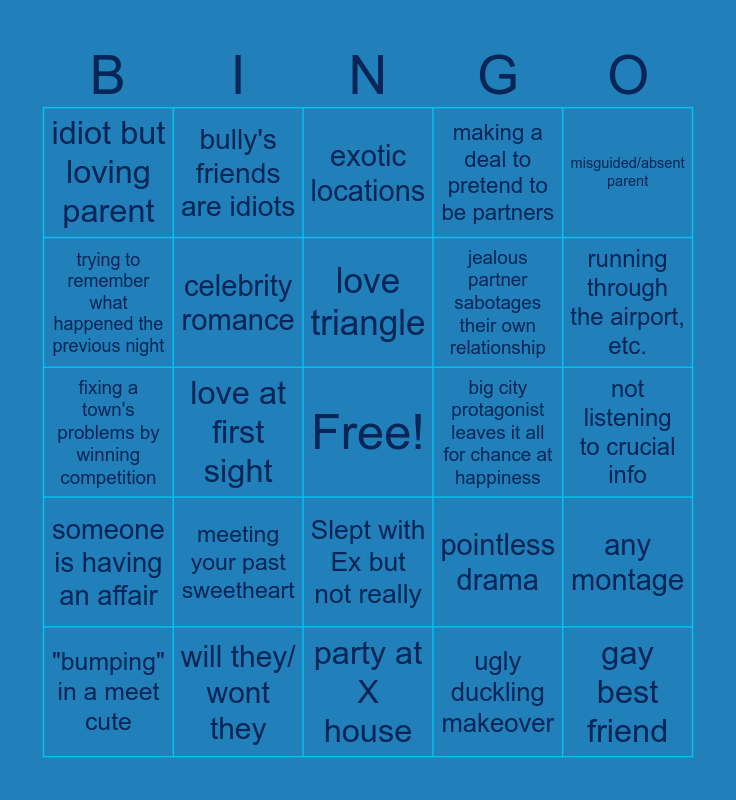 This bingo card has a free space and 26 words: Slept with Ex but not really, ugly duckling makeover, love triangle, will they/ wont they, misguided/absent parent, idiot but loving parent, trying to remember what happened the previous night, bully's friends are idiots, not listening to crucial info, pointless drama, jealous partner sabotages their own relationship, fixing a town's problems by winning competition, any montage, "bumping" in a meet cute, love at first sight, enemies to lovers, making a deal to pretend to be partners, someone is having an affair, exotic locations, gay best friend, running through the airport, etc., party at X house, big city protagonist leaves it all for chance at happiness, meeting your past sweetheart, celebrity romance and divorced couple must cooperate.
