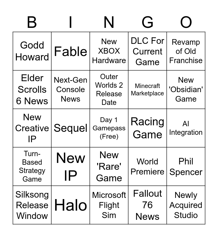 This bingo card has a free space and 24 words: New IP, Halo, Outer Worlds 2 Release Date, Silksong Release Window, Revamp of Old Franchise, Godd Howard, Elder Scrolls 6 News, Fable, Racing Game, New 'Rare' Game, Minecraft Marketplace, New Creative IP, World Premiere, Phil Spencer, Next-Gen Console News, Fallout 76 News, AI Integration, New XBOX Hardware, New 'Obsidian' Game, Sequel, Newly Acquired Studio, Turn-Based Strategy Game, DLC For Current Game and Microsoft Flight Sim.