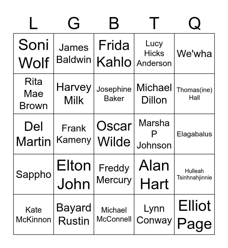 This bingo card has a free space and 59 words: Dr. Margaret Chung, Bayard Rustin, Eleanor Roosevelt, Sylvia Rivera, Hulleah Tsinhnahjinnie, Sally Ride, Harvey Milk, Billie Holiday, Marsha P Johnson, Gladys Bentley, Rita Mae Brown, Alan Turing, Michael Dillon, Anne Bonny, Phyllis Lyon, James Baldwin, Josephine Baker, Lucy Hicks Anderson, Mary Reed, Del Martin, Frank Kameny, Frida Kahlo, Wendy Carlos, Elagabalus, Stormé DeLarverie, Lou Sullivan, Freddy Mercury, Christine Jorgensen, We'wha, Ellen DeGeneres, Keith Haring, Emily Dickinson, Albert Cashier, Ma Rainey, Soni Wolf, Rock Hudson, Florence Nightingale, Alan Hart, Sir Lady Java, Sappho, Andy Warhol, Michael McConnell, Lynn Conway, Roberta Cowell, Audre Lorde, Neil Patrick Harris, Jack Baker, Lili Elbe, Thomas(ine) Hall, Kate McKinnon, George Takei, Ricky Martin, Chelsea Manning, Elliot Page, Rosie O'Donnell, Elton John, Greta Garbo, Billy Tipton and Hunter Schaeffer.