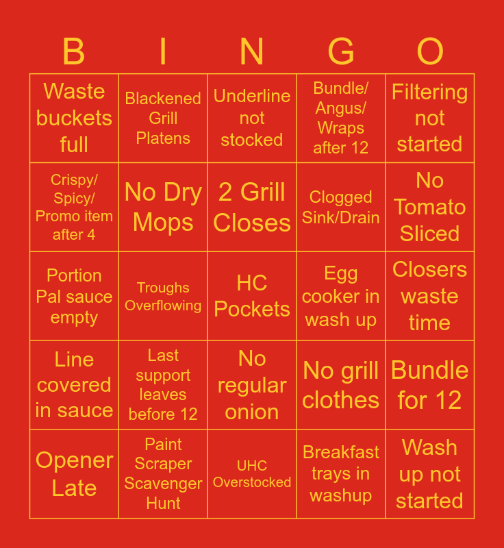 This bingo card has a free space and 24 words: Last support leaves before 12, Paint Scraper Scavenger Hunt, 2 Grill Closes, Opener Late, Filtering not started, Waste buckets full, Crispy/ Spicy/ Promo item after 4, Blackened Grill Platens, Egg cooker in wash up, No regular onion, Clogged Sink/Drain, Portion Pal sauce empty, No grill clothes, Bundle for 12, No Dry Mops, Breakfast trays in washup, Closers waste time, Underline not stocked, No Tomato Sliced, Troughs Overflowing, Wash up not started, Line covered in sauce, Bundle/ Angus/ Wraps after 12 and UHC Overstocked.