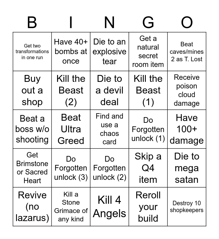 This bingo card has 25 words: Do Forgotten unlock (3), Kill 4 Angels, Die to a devil deal, Revive (no lazarus), Beat caves/mines 2 as T. Lost, Get two transformations in one run, Buy out a shop, Have 40+ bombs at once, Do Forgotten unlock (1), Do Forgotten unlock (2), Kill the Beast (1), Beat a boss w/o shooting, Skip a Q4 item, Die to mega satan, Kill the Beast (2), Destroy 10 shopkeepers, Have 100+ damage, Die to an explosive tear, Receive poison cloud damage, Beat Ultra Greed, Find and use a chaos card, Kill a Stone Grimace of any kind, Get Brimstone or Sacred Heart, Get a natural secret room item and Reroll your build.