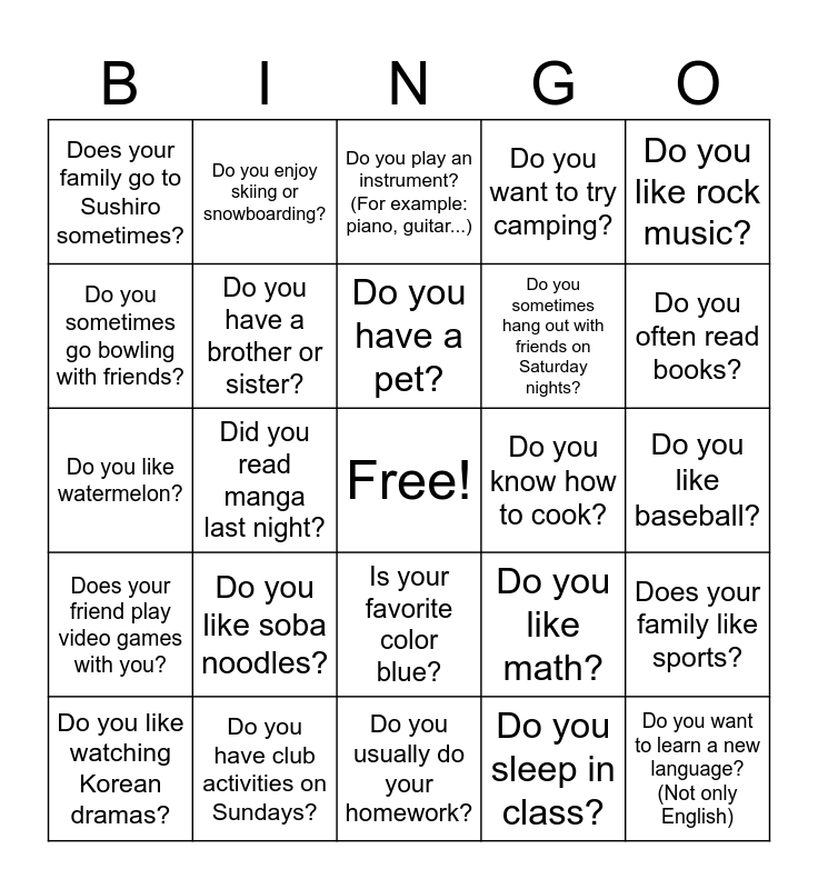 This bingo card has a free space and 24 words: Do you like soba noodles?, Do you have club activities on Sundays?, Do you have a pet?, Do you like watching Korean dramas?, Do you like rock music?, Does your family go to Sushiro sometimes?, Do you sometimes go bowling with friends?, Do you enjoy skiing or snowboarding?, Do you know how to cook?, Is your favorite color blue?, Do you sometimes hang out with friends on Saturday nights?, Do you like watermelon?, Do you like math?, Does your family like sports?, Do you have a brother or sister?, Do you sleep in class?, Do you like baseball?, Do you play an instrument? (For example: piano, guitar...), Do you often read books?, Did you read manga last night?, Do you want to learn a new language? (Not only English), Does your friend play video games with you?, Do you want to try camping? and Do you usually do your homework?.