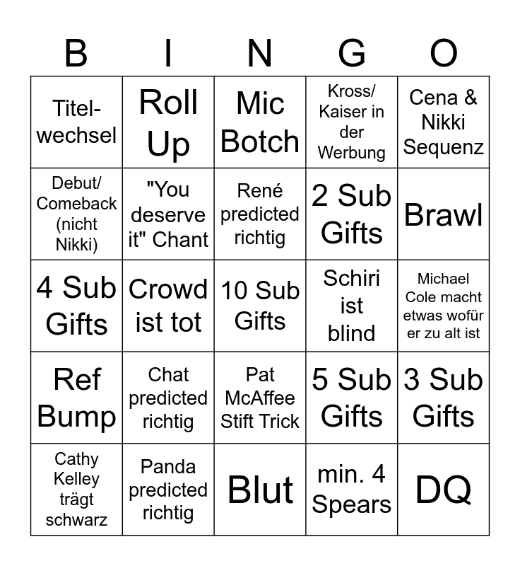 This bingo card has a free space and 24 words: Chat predicted richtig, Panda predicted richtig, René predicted richtig, Cathy Kelley trägt schwarz, Cena & Nikki Sequenz, Titel-wechsel, Debut/ Comeback (nicht Nikki), Roll Up, Schiri ist blind, Pat McAffee Stift Trick, 2 Sub Gifts, 4 Sub Gifts, 5 Sub Gifts, 3 Sub Gifts, "You deserve it" Chant, min. 4 Spears, Michael Cole macht etwas wofür er zu alt ist, Mic Botch, Brawl, Crowd ist tot, DQ, Ref Bump, Kross/ Kaiser in der Werbung and Blut.