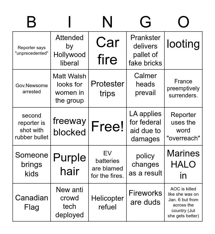 This bingo card has a free space and 24 words: Purple hair, New anti crowd tech deployed, Protester trips, Canadian Flag, looting, Reporter says "unprecedented", Gov.Newsome arrested, Attended by Hollywood liberal, LA applies for federal aid due to damages, EV batteries are blamed for the fires., Calmer heads prevail, second reporter is shot with rubber bullet, policy changes as a result, Marines HALO in, Matt Walsh looks for women in the group, Fireworks are duds, Reporter uses the word "overreach", Car fire, France preemptively surrenders., freeway blocked, AOC is killed like she was on Jan. 6 but from across the country (Jut she gets better), Someone brings kids, Prankster delivers pallet of fake bricks and Helicopter refuel.