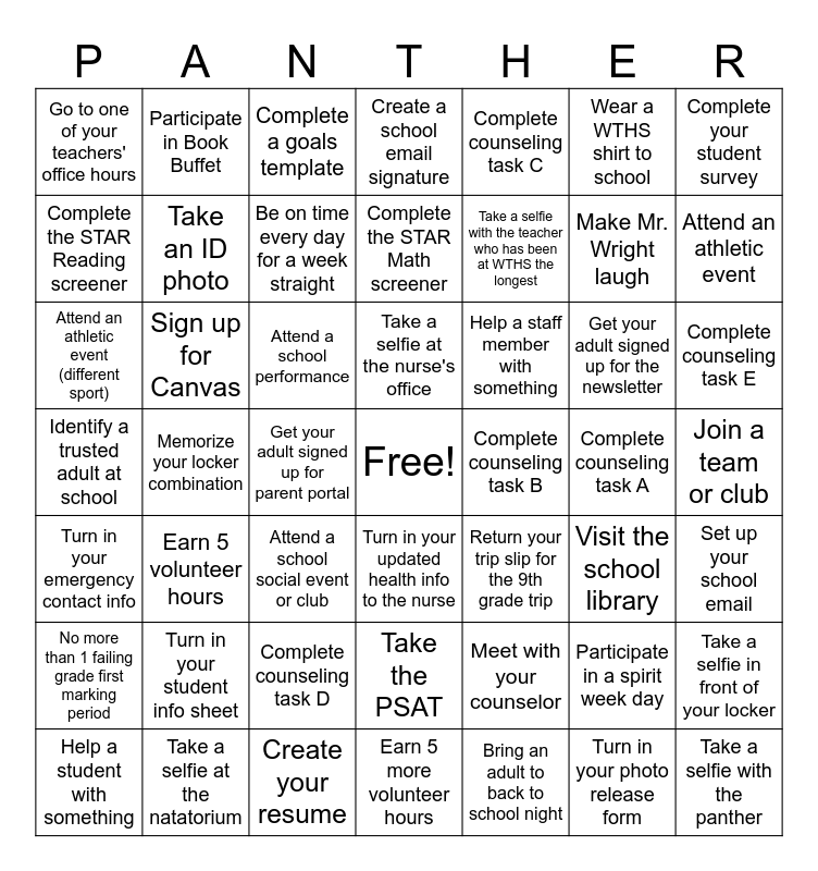 This bingo card has a free space and 48 words: Meet with your counselor, Make Mr. Wright laugh, Earn 5 more volunteer hours, Memorize your locker combination, Attend a school performance, Join a team or club, Participate in Book Buffet, Take a selfie at the natatorium, Wear a WTHS shirt to school, Turn in your updated health info to the nurse, Complete your student survey, Create a school email signature, Get your adult signed up for the newsletter, Help a staff member with something, No more than 1 failing grade first marking period, Complete counseling task A, Complete the STAR Reading screener, Attend an athletic event, Participate in a spirit week day, Complete counseling task C, Take a selfie with the teacher who has been at WTHS the longest, Get your adult signed up for parent portal, Go to one of your teachers' office hours, Take an ID photo, Take a selfie in front of your locker, Be on time every day for a week straight, Complete counseling task E, Help a student with something, Take a selfie at the nurse's office, Sign up for Canvas, Turn in your photo release form, Complete counseling task B, Set up your school email, Turn in your student info sheet, Identify a trusted adult at school, Return your trip slip for the 9th grade trip, Visit the school library, Attend an athletic event (different sport), Attend a school social event or club, Complete counseling task D, Turn in your emergency contact info, Take a selfie with the panther, Complete a goals template, Create your resume, Complete the STAR Math screener, Take the PSAT, Earn 5 volunteer hours and Bring an adult to back to school night.