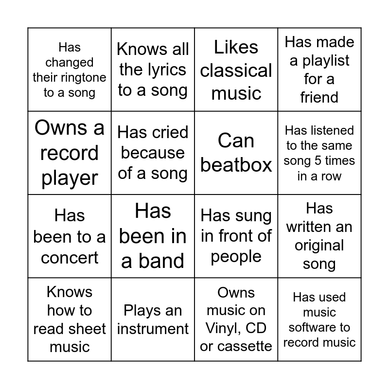 This bingo card has 16 words: Plays an instrument, Has written an original song, Likes classical music, Has changed their ringtone to a song, Has been to a concert, Knows all the lyrics to a song, Has sung in front of people, Owns music on Vinyl, CD or cassette, Owns a record player, Has cried because of a song, Knows how to read sheet music, Has made a playlist for a friend, Has been in a band, Has listened to the same song 5 times in a row, Can beatbox and Has used music software to record music.