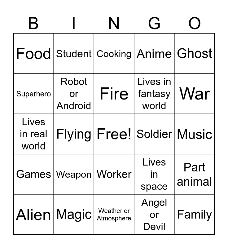 This bingo card has a free space and 24 words: Weapon, Magic, Fire, Alien, Ghost, Food, Superhero, Student, Soldier, Worker, Lives in fantasy world, Lives in real world, Lives in space, Part animal, Robot or Android, Angel or Devil, Music, Cooking, War, Flying, Family, Games, Anime and Weather or Atmosphere.
