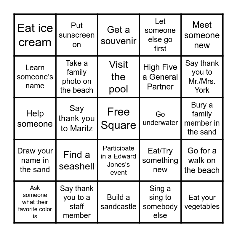 This bingo card has a free space and 24 words: Find a seashell, Say thank you to a staff member, Visit the pool, Ask someone what their favorite color is, Meet someone new, Eat ice cream, Learn someone’s name, Put sunscreen on, Go underwater, Participate in a Edward Jones’s event, High Five a General Partner, Help someone, Eat/Try something new, Go for a walk on the beach, Take a family photo on the beach, Sing a sing to somebody else, Bury a family member in the sand, Get a souvenir, Say thank you to Mr./Mrs. York, Say thank you to Maritz, Eat your vegetables, Draw your name in the sand, Let someone else go first and Build a sandcastle.