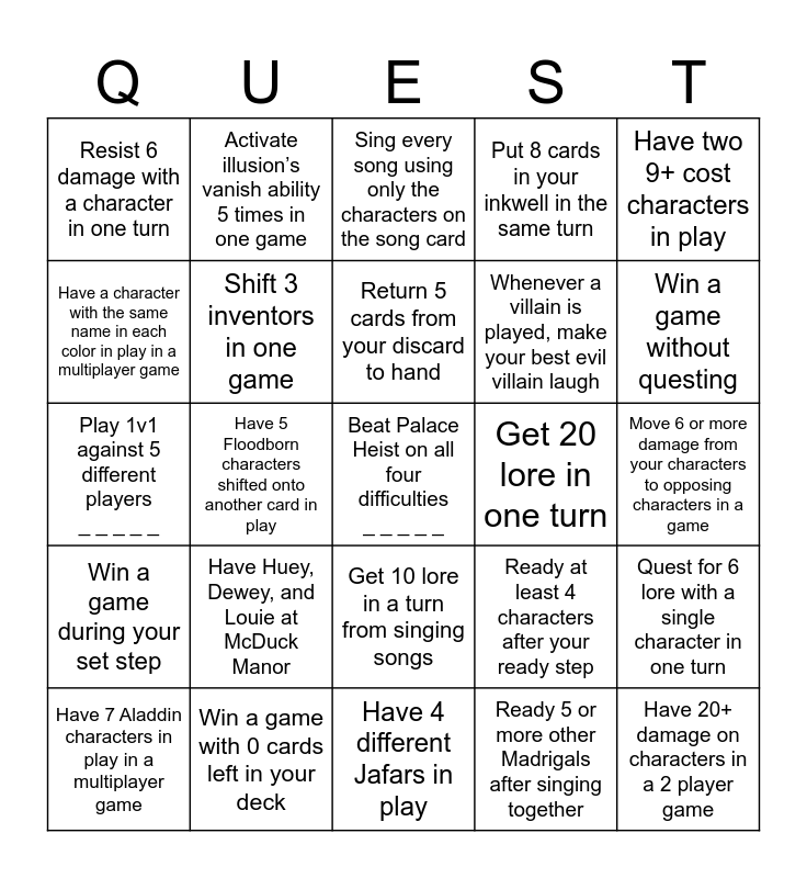 This bingo card has a free space and 24 words: Have Huey, Dewey, and Louie at McDuck Manor, Win a game with 0 cards left in your deck, Return 5 cards from your discard to hand, Have 7 Aladdin characters in play in a multiplayer game, Have two 9+ cost characters in play, Resist 6 damage with a character in one turn, Have a character with the same name in each color in play in a multiplayer game, Activate illusion’s vanish ability 5 times in one game, Get 20 lore in one turn, Get 10 lore in a turn from singing songs, Whenever a villain is played, make your best evil villain laugh, Play 1v1 against 5 different players _ _ _ _ _, Ready at least 4 characters after your ready step, Quest for 6 lore with a single character in one turn, Shift 3 inventors in one game, Ready 5 or more other Madrigals after singing together, Move 6 or more damage from your characters to opposing characters in a game, Sing every song using only the characters on the song card, Win a game without questing, Have 5 Floodborn characters shifted onto another card in play, Have 20+ damage on characters in a 2 player game, Win a game during your set step, Put 8 cards in your inkwell in the same turn and Have 4 different Jafars in play.