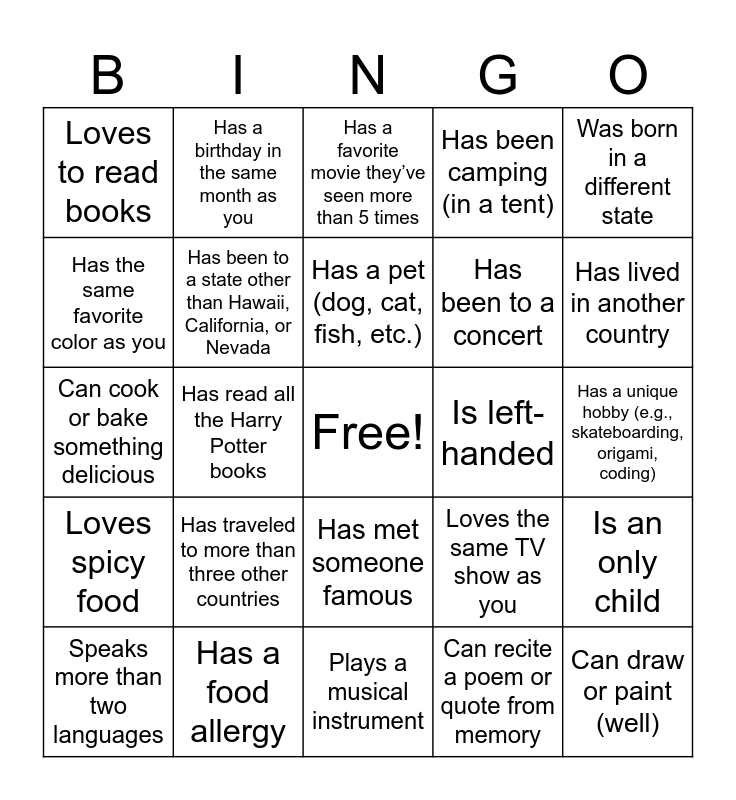 This bingo card has a free space and 25 words: Has traveled to more than three other countries, Plays a musical instrument, Has a pet (dog, cat, fish, etc.), Speaks more than two languages, Was born in a different state, Loves to read books, Has the same favorite color as you, Has a birthday in the same month as you, Is left-handed, Has met someone famous, Has been to a concert, Can cook or bake something delicious, Loves the same TV show as you, Is an only child, Has been to a state other than Hawaii, California, or Nevada, Can say the alphabet backwards, Has a unique hobby (e.g., skateboarding, origami, coding), Has a favorite movie they’ve seen more than 5 times, Has lived in another country, Has read all the Harry Potter books, Can draw or paint (well), Has a food allergy, Loves spicy food, Has been camping (in a tent) and Can recite a poem or quote from memory.