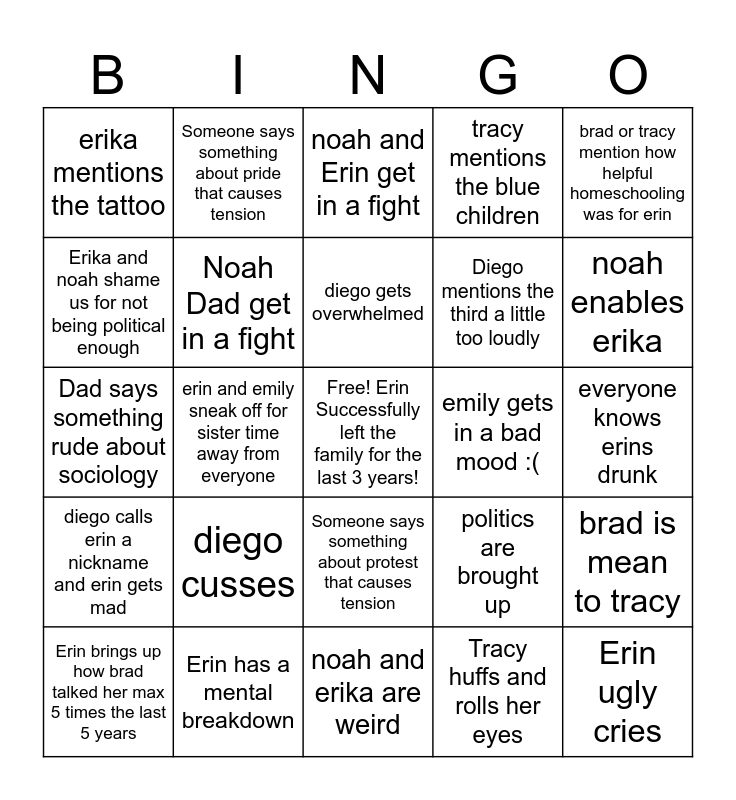 This bingo card has a free space and 29 words: Erin +Brad get in a fight, Erin has a mental breakdown, noah and Erin get in a fight, dad says something rude about geology, brad or tracy mention how helpful homeschooling was for erin, erika mentions the tattoo, Noah Dad get in a fight, diego gets overwhelmed, emily gets in a bad mood :(, brad is mean to tracy, Erin brings up how brad talked her max 5 times the last 5 years, erin and emily sneak off for sister time away from everyone, Tracy huffs and rolls her eyes, Erin ugly cries, Dad says something rude about sociology, erin is extremely overstimulated, noah and erika are weird, politics are brought up, noah enables erika, diego calls erin a nickname and erin gets mad, diego cusses, erin gets mad and leaves after saying something fire, Diego mentions the third a little too loudly, everyone knows erins drunk, Erika and noah shame us for not being political enough, Someone says something about pride that causes tension, Someone says something about protest that causes tension, tracy mentions the blue children and tracy says something about how she cant talk freely.