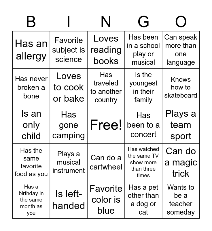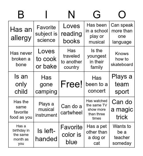 This bingo card has a free space and 24 words: Has a birthday in the same month as you, Plays a musical instrument, Has traveled to another country, Has a pet other than a dog or cat, Can speak more than one language, Has an allergy, Favorite subject is science, Loves reading books, Has been to a concert, Plays a team sport, Is an only child, Loves to cook or bake, Has watched the same TV show more than three times, Can do a magic trick, Has never broken a bone, Is left-handed, Favorite color is blue, Has been in a school play or musical, Knows how to skateboard, Has the same favorite food as you, Has gone camping, Can do a cartwheel, Is the youngest in their family and Wants to be a teacher someday.