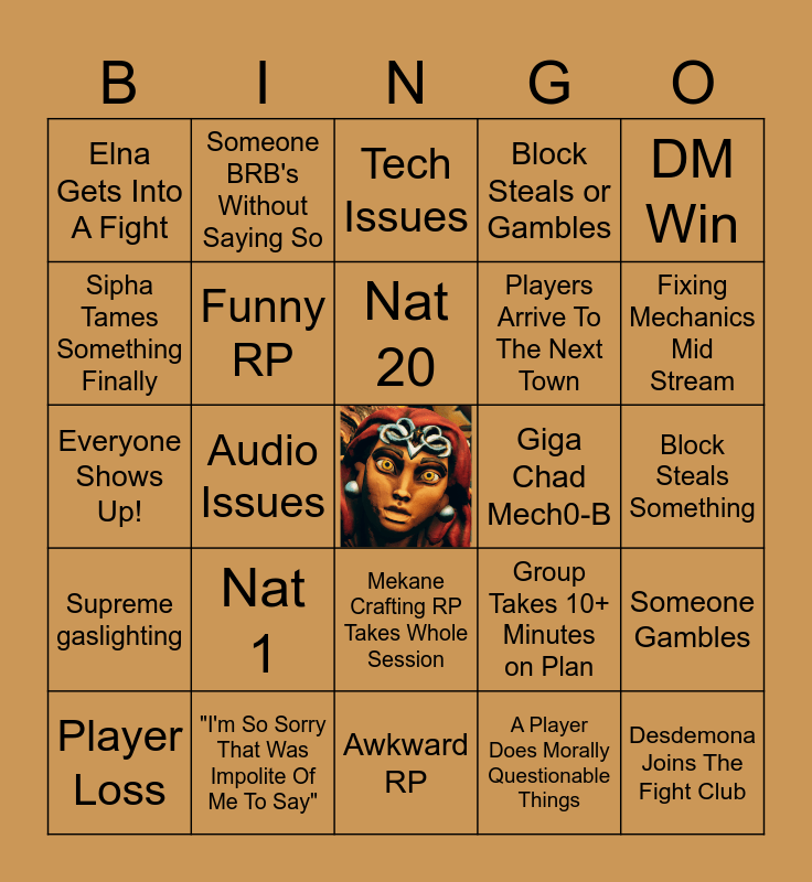 This bingo card has a free space and 24 words: Nat 1, "I'm So Sorry That Was Impolite Of Me To Say", Nat 20, Player Loss, DM Win, Elna Gets Into A Fight, Sipha Tames Something Finally, Someone BRB's Without Saying So, Giga Chad Mech0-B, Mekane Crafting RP Takes Whole Session, Players Arrive To The Next Town, Everyone Shows Up!, Group Takes 10+ Minutes on Plan, Someone Gambles, Funny RP, A Player Does Morally Questionable Things, Block Steals Something, Tech Issues, Fixing Mechanics Mid Stream, Audio Issues, Desdemona Joins The Fight Club, Supreme gaslighting, Block Steals or Gambles and Awkward RP.