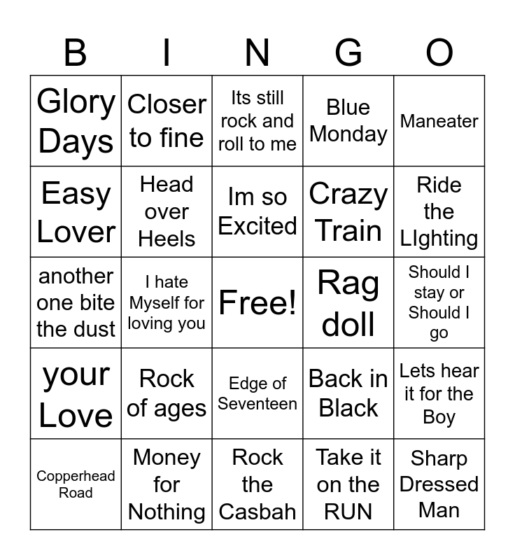 This bingo card has a free space and 29 words: Copperhead Road, Highwayman, I hate Myself for loving you, Nothin' But a good Time, Glory Days, Its still rock and roll to me, Head over Heels, Rock of ages, Rag doll, Money for Nothing, Should I stay or Should I go, Sharp Dressed Man, Rock the Casbah, Take it on the RUN, Ride the LIghting, Tom Sawyer, Edge of Seventeen, your Love, Maneater, another one bite the dust, Back in Black, You spin me round, Crazy Train, Easy Lover, Blue Monday, Closer to fine, Lets hear it for the Boy, Im so Excited and How will I know.