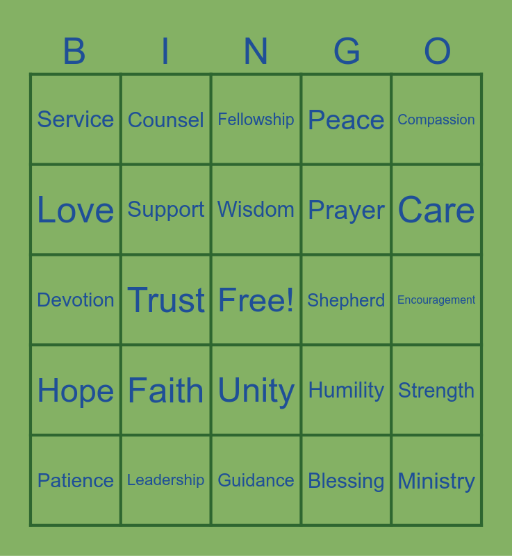 This bingo card has a free space and 25 words: Faith, Guidance, Wisdom, Patience, Compassion, Service, Love, Counsel, Shepherd, Unity, Prayer, Devotion, Humility, Strength, Support, Teaching, Encouragement, Fellowship, Care, Trust, Ministry, Leadership, Hope, Peace and Blessing.