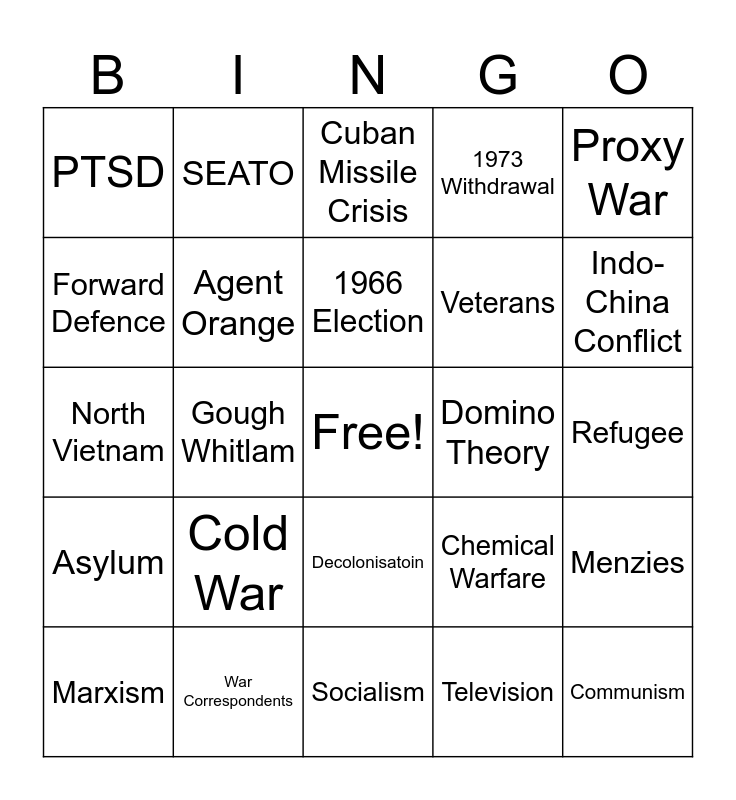 This bingo card has a free space and 52 words: Vietnam War, Communism, Capitalism, Socialism, Cold War, ANZUS, SEATO, United Nations, Forward Defence, Labour Party, Agent Orange, Conscription, Menzies, Chemical Warfare, Guerrilla Warfare, Viet Cong, 1966 Election, Domino Theory, Robert Menzies, Proxy War, Gough Whitlam, Television, PTSD, Veterans, Australian War Memorial, The Fab Four, Save Our Sons, Red Scar, Indo-China Conflict, Malayan Emergency, Korean War, 1973 Withdrawal, Vietnam War Memorial, War Nurses, Cold War, Cuban Missile Crisis, War Correspondents, Facism, Democracy, Battle of Long Tan, Alliances, Refugee, Asylum, Iron Curtain, Decolonisatoin, Colonisation, Totalitarianism, North Vietnam, South Vietnam, National Liberation Front, Marxism and Peace.