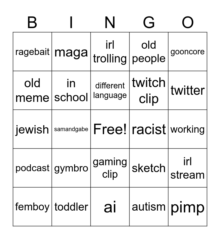 This bingo card has a free space and 24 words: gymbro, toddler, different language, femboy, gooncore, ragebait, old meme, maga, racist, gaming clip, twitch clip, jewish, sketch, irl stream, in school, autism, working, irl trolling, twitter, samandgabe, pimp, podcast, old people and ai.
