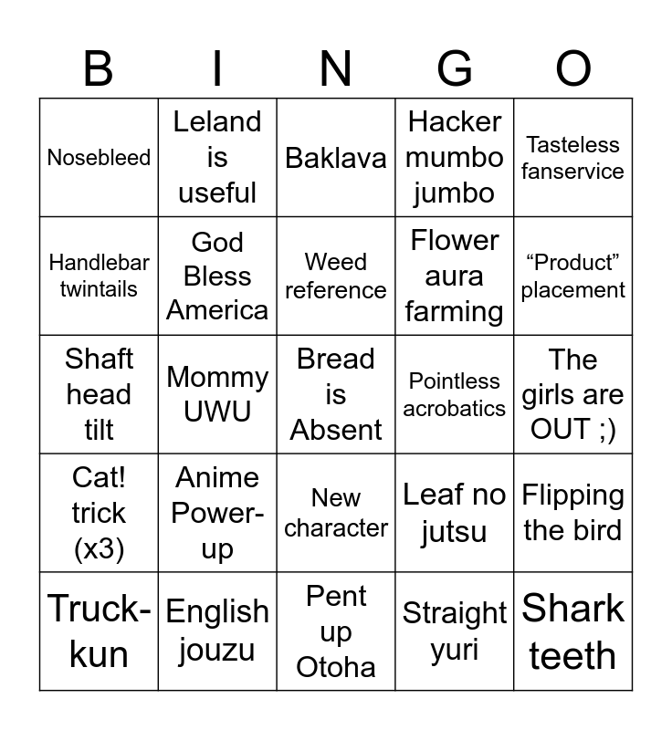 This bingo card has a free space and 27 words: Leaf no jutsu, Satoko abuse, Flower aura farming, Pent up Otoha, Handlebar twintails, Baklava, Leland is useful, Cat! trick (x3), Pointless acrobatics, Flipping the bird, Shaft head tilt, Hacker mumbo jumbo, Truck-kun, English jouzu, “Product” placement, 9/11 reference, God Bless America, Weed reference, Anime Power-up, Nosebleed, The girls are OUT ;), Straight yuri, Mommy UWU, Shark teeth, New character, Tasteless fanservice and Ghibli food.