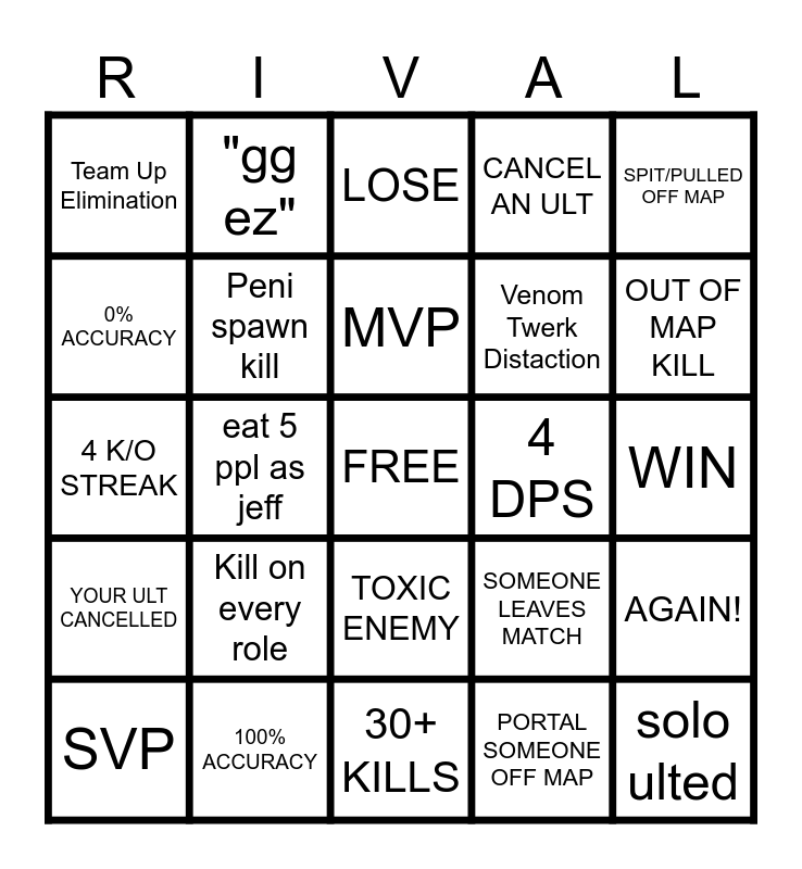 This bingo card has a free space and 24 words: Kill on every role, 100% ACCURACY, MVP, SVP, SPIT/PULLED OFF MAP, Team Up Elimination, 0% ACCURACY, "gg ez", 4 DPS, TOXIC ENEMY, Venom Twerk Distaction, 4 K/O STREAK, SOMEONE LEAVES MATCH, AGAIN!, Peni spawn kill, PORTAL SOMEONE OFF MAP, WIN, LOSE, OUT OF MAP KILL, eat 5 ppl as jeff, solo ulted, YOUR ULT CANCELLED, CANCEL AN ULT and 30+ KILLS.