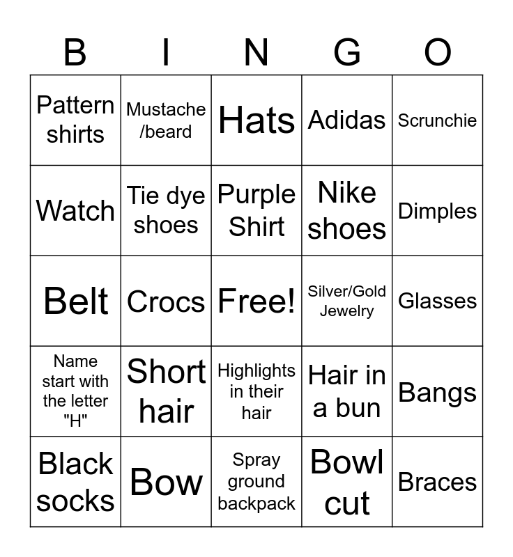 This bingo card has a free space and 24 words: Short hair, Bow, Purple Shirt, Black socks, Scrunchie, Pattern shirts, Watch, Mustache /beard, Silver/Gold Jewelry, Highlights in their hair, Nike shoes, Belt, Hair in a bun, Bangs, Tie dye shoes, Bowl cut, Glasses, Hats, Dimples, Crocs, Braces, Name start with the letter "H", Adidas and Spray ground backpack.