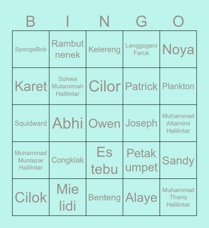 This bingo card has a free space and 24 words: Congklak, Mie lidi, Cilor, Cilok, Noya, SpongeBob, Karet, Rambut nenek, Joseph, Es tebu, Patrick, Squidward, Petak umpet, Sandy, Sohwa Mutamimah Halilintar, Alaye, Muhammad Attamimi Halilintar, Kelereng, Plankton, Abhi, Muhammad Thariq Halilintar, Muhammad Muntazar Halilintar, Lenggogeni Faruk and Benteng.