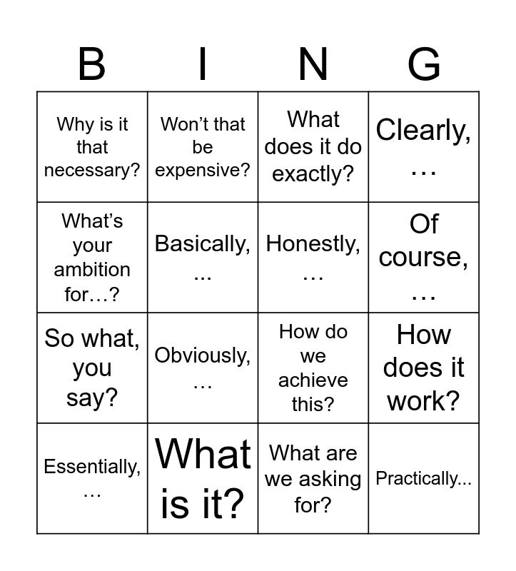 This bingo card has 16 words: What is it?, How does it work?, What does it do exactly?, Why is it that necessary?, So what, you say?, Won’t that be expensive?, How do we achieve this?, What are we asking for?, What’s your ambition for…?, Basically, ..., Essentially, …, Clearly, …, Obviously, …, Of course, …, Honestly, … and Practically....