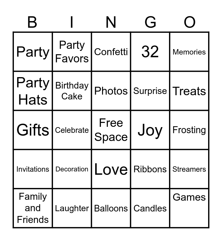 This bingo card has a free space and 24 words: Decoration, Laughter, Photos, Family and Friends, Memories, Party, Party Hats, Party Favors, Joy, Love, Surprise, Gifts, Ribbons, Streamers, Birthday Cake, Candles, Frosting, Confetti, Treats, Celebrate, Games, Invitations, 32 and Balloons.