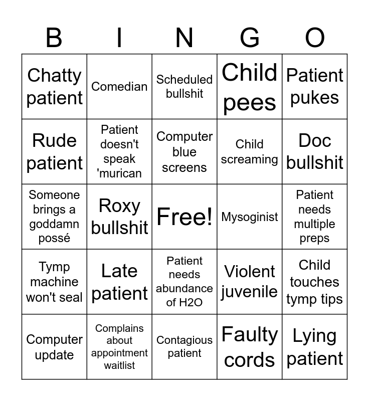 This bingo card has a free space and 24 words: Late patient, Complains about appointment waitlist, Computer blue screens, Computer update, Patient pukes, Chatty patient, Rude patient, Comedian, Mysoginist, Patient needs abundance of H2O, Child screaming, Someone brings a goddamn possé, Violent juvenile, Child touches tymp tips, Patient doesn't speak 'murican, Faulty cords, Patient needs multiple preps, Scheduled bullshit, Doc bullshit, Roxy bullshit, Lying patient, Tymp machine won't seal, Child pees and Contagious patient.