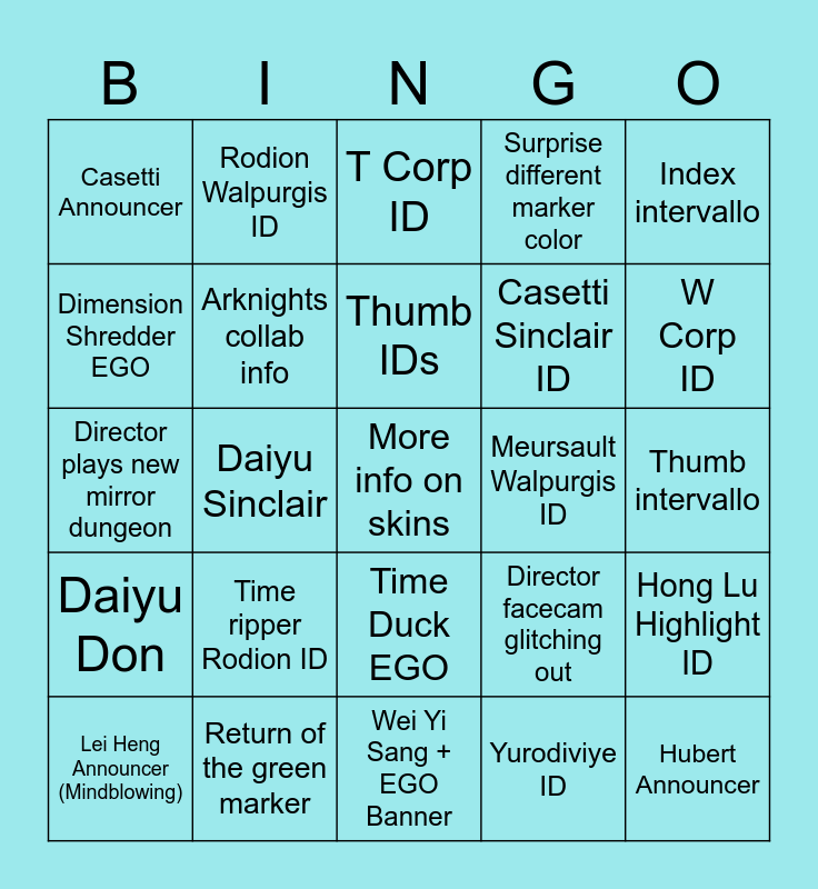 This bingo card has 25 words: Time ripper Rodion ID, Wei Yi Sang + EGO Banner, Thumb IDs, Lei Heng Announcer (Mindblowing), Index intervallo, Casetti Announcer, Dimension Shredder EGO, Rodion Walpurgis ID, Meursault Walpurgis ID, Time Duck EGO, Casetti Sinclair ID, Director plays new mirror dungeon, Director facecam glitching out, Hong Lu Highlight ID, Arknights collab info, Hubert Announcer, Thumb intervallo, T Corp ID, W Corp ID, Daiyu Sinclair, More info on skins, Return of the green marker, Daiyu Don, Surprise different marker color and Yurodiviye ID.