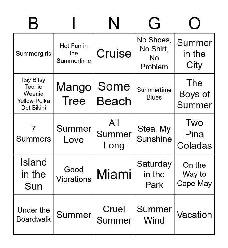 This bingo card has 48 words: Free!, All Summer Long, Cool For the Summer, Cruel Summer, Good Vibrations, Heat Wave, Hot Fun in the Summertime, In the Summertime, Itsy Bitsy Teenie Weenie Yellow Polka Dot Bikini, Kokomo, Mango Tree, No Shoes, No Shirt, No Problem, On the Way to Cape May, Saturday in the Park, Soak Up the Sun, School’s Out, Some Beach, Steal My Sunshine, Summer Breeze, Summer in the City, Summer Love, Summer Wind, Summergirls, Summertime Blues, Sun is Shining, The Boys of Summer, Under the Boardwalk, Pocketful of Sunshine, Miami, Island in the Sun, Pontoon, Beachin’, Surf City, Summer of 69, Summer, Endless Summer Nights, Sun Daze, Two Pina Coladas, Margaritaville, Toes, Surfin’ Bird, Vacation, Cruise, Long Hot Summer, 7 Summers, Smooth, When the Sun Goes Down and Somewhere on a Beach.