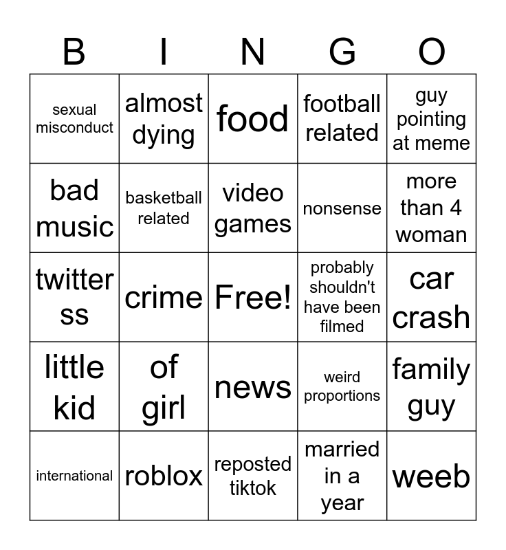 This bingo card has a free space and 24 words: of girl, roblox, video games, international, guy pointing at meme, sexual misconduct, bad music, almost dying, probably shouldn't have been filmed, news, nonsense, twitter ss, weird proportions, family guy, basketball related, married in a year, car crash, food, more than 4 woman, crime, weeb, little kid, football related and reposted tiktok.