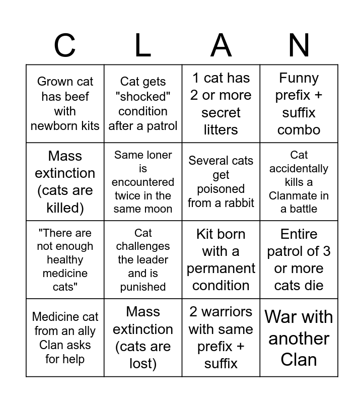 This bingo card has 32 words: Kittypet with silly name joins the Clan, Disease outbreak, Entire patrol of 3 or more cats die, Warrior murders their Clanmate, War with another Clan, Several cats get poisoned from a rabbit, Mass extinction (cats are killed), Queen incorrectly predicts the size of their litter, Cat gets "shocked" condition after a patrol, Cat gets killed on the Thunderpath, Cat accidentally kills a Clanmate in a battle, 1 cat has 2 or more secret litters, Cat has kits with someone other than their mate, Leader loses all remaining lives in one event, Mass extinction (cats are lost), Two kits from the same litter are given the same name, Cat gets taken away by Twolegs and is lost, Kit born with a permanent condition, Cat gains a permanent condition after an injury, Abandoned kits are found and adopted, Cat gets rejected twice in the same moon, Medicine cat kills someone, 2 warriors with same prefix + suffix, Cat mentors an apprentice with the same prefix as them, Medicine cat from an ally Clan asks for help, Funny prefix + suffix combo, "There are not enough healthy medicine cats", Same loner is encountered twice in the same moon, Grown cat has beef with newborn kits, Cat dies while giving birth, Cat named after a Pokémon joins the Clan and Cat challenges the leader and is punished.