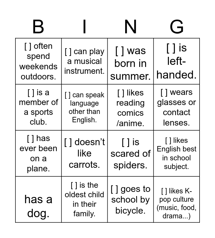 This bingo card has 16 words: has a dog., [ ] is the oldest child in their family., [ ] was born in summer., [ ] is left- handed., [ ] is a member of a sports club., [ ] can play a musical instrument., [ ] is scared of spiders., [ ] likes English best in school subject., [ ] often spend weekends outdoors., [ ] can speak language other than English., [ ] goes to school by bicycle., [ ] wears glasses or contact lenses., [ ] has ever been on a plane., [ ] doesn’t like carrots., [ ] likes reading comics /anime. and [ ] likes K-pop culture (music, food, drama...).