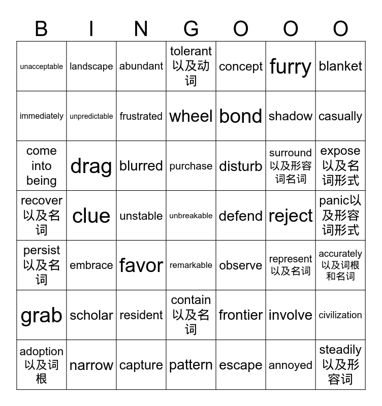 This bingo card has 53 words: capture, shadow, delete, unstable, blurred, accurately以及词根和名词, landscape, steadily以及形容词, furry, grab, blanket, observe, surround以及形容词名词, disturb, involve, expose以及名词形式, immediately, casually, pattern, concept, bond, unbreakable, unpredictable, unacceptable, escape, recover以及名词, persist以及名词, annoyed, panic以及形容词形式, frustrated, describe, remarkable, frontier, civilization, represent以及名词, embrace, tolerant以及动词, clue, abundant, scholar, resident, contain以及名词, come into being, massive, adoption以及词根, purchase, reject, favor, wheel, drag, narrow, defend and puzzled.