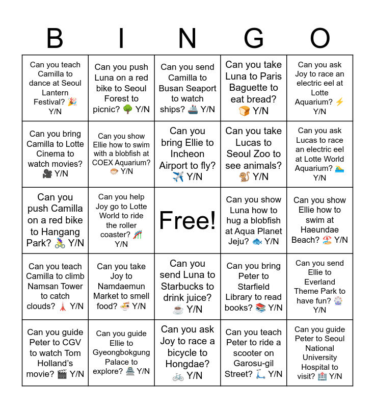 This bingo card has a free space and 33 words: Can you take Peter to a gun shop to find a toy gun? π© Y/N, Can you bring Luna to a knife shot to choose a new knife? βοΈ Y/N, Can you help Joy go to Lotte World to ride the roller coaster? π’ Y/N, Can you send Lucas to Everland to feed animals? π¦ Y/N, Can you teach Camilla to climb Namsan Tower to catch clouds? πΌ Y/N, Can you show Ellie how to swim with a blobfish at COEX Aquarium? π‘ Y/N, Can you ask Joy to race an electric eel at Lotte Aquarium? β‘ Y/N, Can you guide Peter to CGV to watch Tom Hollandβs movie? π¬ Y/N, Can you push Luna on a red bike to Seoul Forest to picnic? π³ Y/N, Can you take Lucas to Taekwondo Academy to practice kicks? π₯ Y/N, Can you bring Ellie to Incheon Airport to fly? βοΈ Y/N, Can you send Camilla to Busan Seaport to watch ships? π’ Y/N, Can you help Joy visit GS25 to buy snacks? πͺ Y/N, Can you teach Peter to float with balloons at Childrenβs Grand Park? π Y/N, Can you show Luna how to hug a blobfish at Aqua Planet Jeju? π Y/N, Can you ask Lucas to race an electric eel at Lotte World Aquarium? πββοΈ Y/N, Can you guide Ellie to Gyeongbokgung Palace to explore? π― Y/N, Can you push Camilla on a red bike to Hangang Park? π΄ββοΈ Y/N, Can you take Joy to Namdaemun Market to smell food? π Y/N, Can you bring Peter to Starfield Library to read books? π Y/N, Can you send Luna to Starbucks to drink juice? β Y/N, Can you help Lucas hike Bukhansan Mountain? β°οΈ Y/N, Can you teach Camilla to dance at Seoul Lantern Festival? π Y/N, Can you show Ellie how to swim at Haeundae Beach? ποΈ Y/N, Can you ask Joy to race a bicycle to Hongdae? π² Y/N, Can you guide Peter to Seoul National University Hospital to visit? π₯ Y/N, Can you take Luna to Paris Baguette to eat bread? π Y/N, Can you take Lucas to Seoul Zoo to see animals? π Y/N, Can you bring Camilla to Lotte Cinema to watch movies? π₯ Y/N, Can you send Ellie to Everland Theme Park to have fun? π‘ Y/N, Can you help Joy fly to Jeju Island to relax? ποΈ Y/N, Can you teach Peter to ride a scooter on Garosu-gil Street? π΄ Y/N and Can you show Luna how to skateboard at Olympic Park Skatepark? πΉ Y/N.