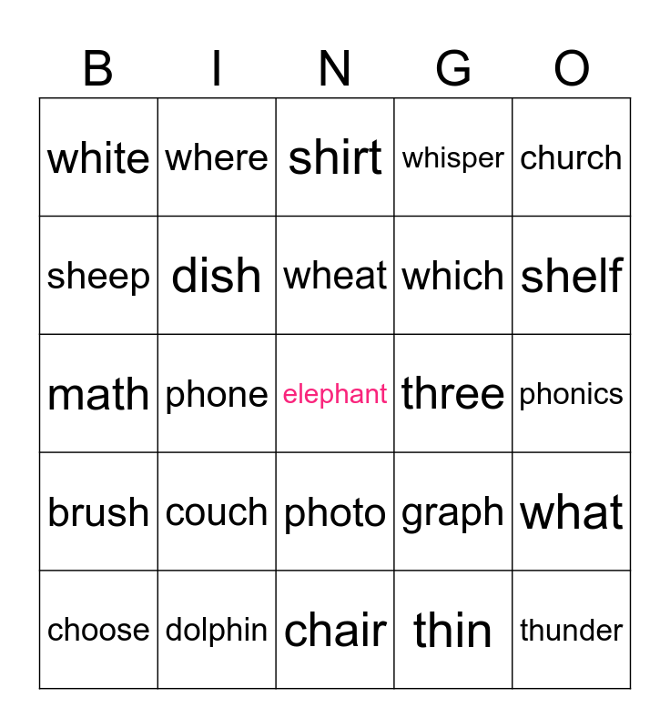 This bingo card has a free space and 24 words: couch, dolphin, wheat, choose, church, white, sheep, where, three, photo, which, math, graph, what, dish, thin, phonics, shirt, shelf, phone, thunder, brush, whisper and chair.