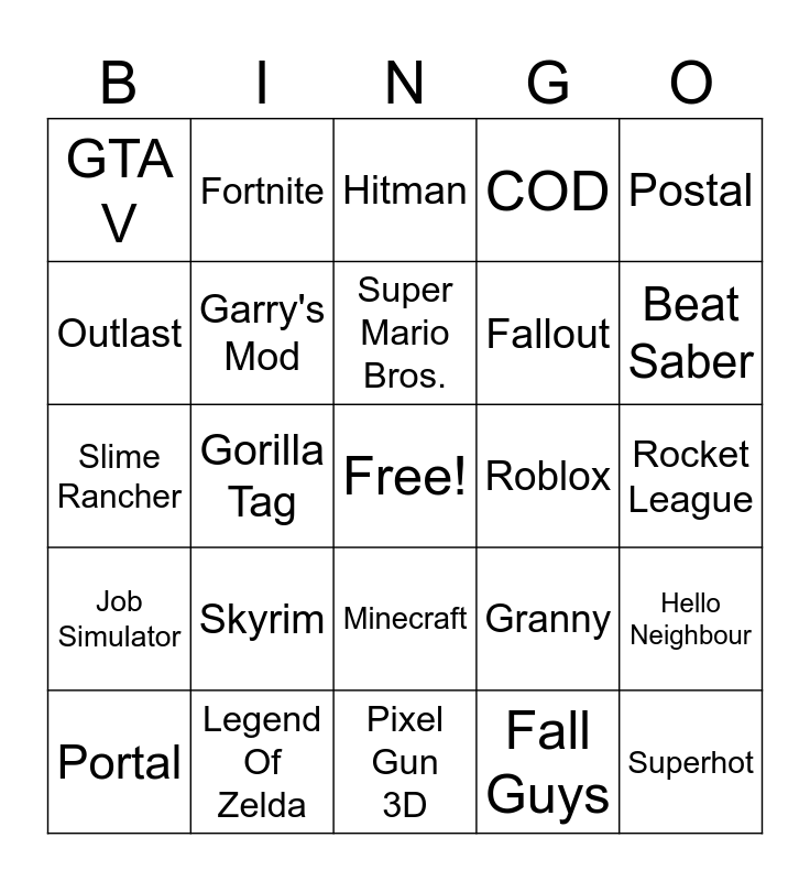 This bingo card has a free space and 24 words: Skyrim, Legend Of Zelda, Super Mario Bros., Portal, Postal, GTA V, Outlast, Fortnite, Roblox, Minecraft, Fallout, Slime Rancher, Granny, Hello Neighbour, Garry's Mod, Fall Guys, Rocket League, Hitman, Beat Saber, Gorilla Tag, Superhot, Job Simulator, COD and Pixel Gun 3D.