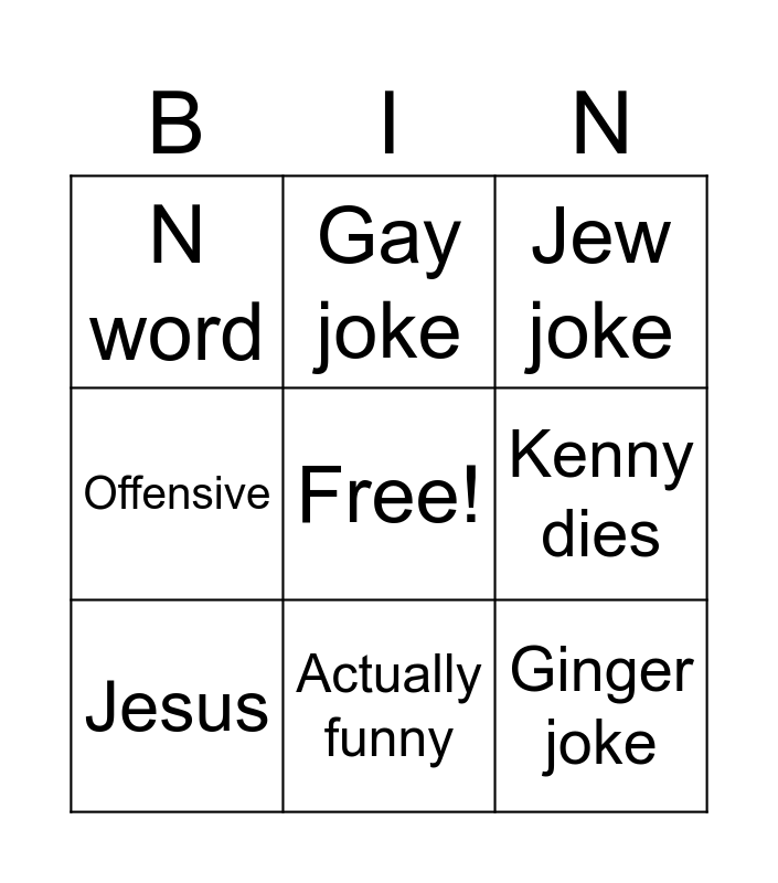 This bingo card has a free space and 8 words: Kenny dies, Jew joke, Gay joke, Jesus, N word, Ginger joke, Offensive and Actually funny.