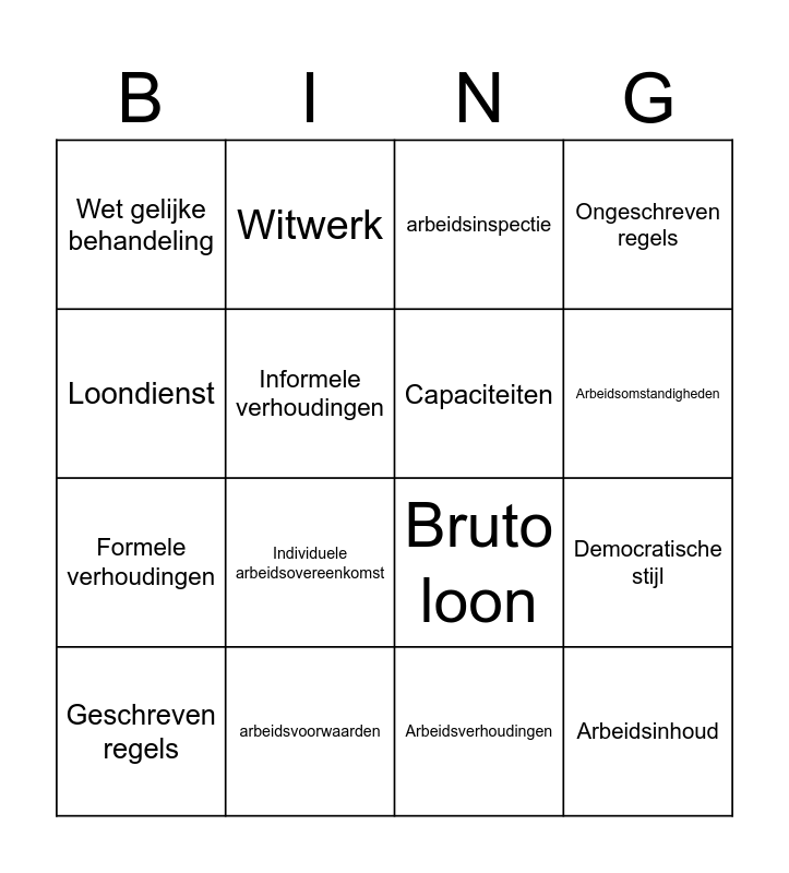This bingo card has 34 words: Werk, Basisbehoeften, Status, Identiteit, Arbeidsinhoud, Capaciteiten, Loondienst, zelfstandige, Witwerk, Zwartwerk, Arbeidsomstandigheden, arbeidsinspectie, Arbowet, Arbeidsbesluit jeugdigen, arbeidsvoorwaarden, Individuele arbeidsovereenkomst, cao, Bruto loon, Netto loon, Minimumloon, Opzegtermijn, Ontslag op staande voet, Wet gelijke behandeling, Arbeidsverhoudingen, bedrijfscultuur, Geschreven regels, Ongeschreven regels, Ethische code, Formele verhoudingen, Informele verhoudingen, Autoritaire stijl, Democratische stijl, Raadplegende stijl and AOW.