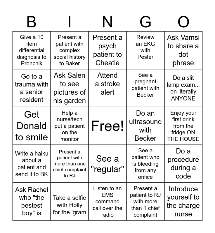 This bingo card has a free space and 24 words: Present a patient with more than one chief complaint to RJ, Take a selfie with Holly for the 'gram, Attend a stroke alert, Ask Rachel who "the bestest boy" is, Ask Vamsi to share a dot phrase, Give a 10 item differential diagnosis to Pronchik, Go to a trauma with a senior resident, Present a patient with complex social history to Baker, Do an ultrasound with Becker, See a "regular", See a pregnant patient with Becker, Get Donald to smile, See a patient who is bleeding from any orifice, Do a procedure during a code, Ask Salen to see pictures of his garden, Present a patient to RJ with more than 1 chief complaint, Enjoy your first drink from the fridge ON THE HOUSE, Present a psych patient to Cheatle, Do a slit lamp exam... on literally ANYONE, Help a nurse/tech put a patient on the monitor, Introduce yourself to the charge nurse, Write a haiku about a patient and send it to BK, Review an EKG with Pester and Listen to an EMS command call over the radio.