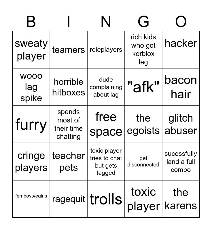 This bingo card has a free space and 24 words: femboys/egirls, teacher pets, dude complaining about lag, toxic player, hacker, sweaty player, teamers, roleplayers, the egoists, glitch abuser, furry, horrible hitboxes, get disconnected, sucessfully land a full combo, wooo lag spike, ragequit, trolls, rich kids who got korblox leg, bacon hair, cringe players, spends most of their time chatting, toxic player tries to chat but gets tagged, "afk" and the karens.