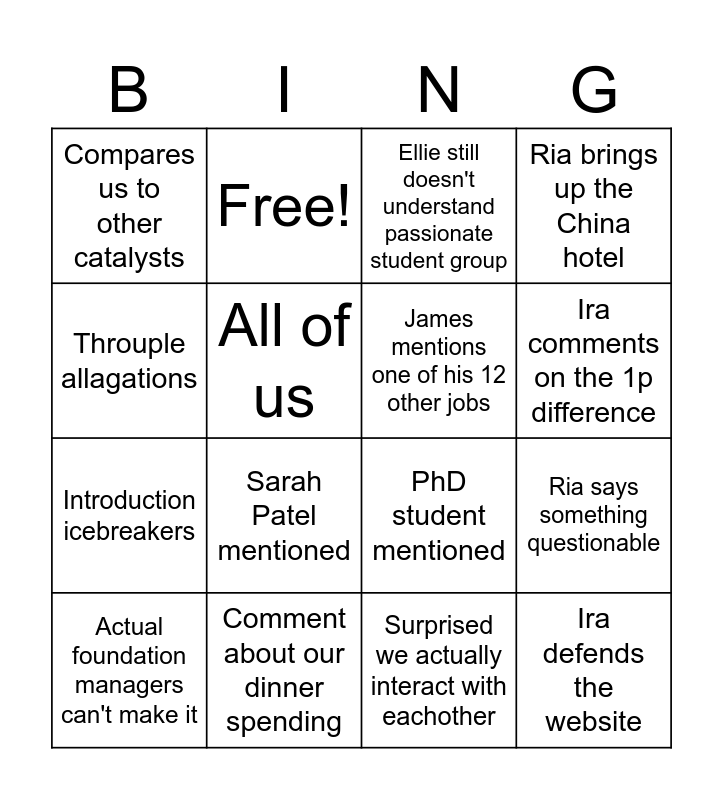 This bingo card has 19 words: PhD student mentioned, Get told off for not doing review document, Ellie still doesn't understand passionate student group, Ira defends the website, Ria says something questionable, Throuple allagations, Surprised we actually interact with eachother, Compares us to other catalysts, Free!, Introduction icebreakers, Sarah Patel mentioned, All of us, James mentions one of his 12 other jobs, Comment about our dinner spending, Actual foundation managers can't make it, Ira pops off about Ivy, Ria brings up the China hotel, Ira comments on the 1p difference and Someone mentions tiramasu or bubble tea.