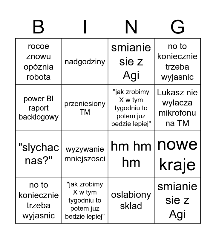 This bingo card has 23 words: smianie sie z Agi, wzajemne wsparcie, Lukasz nie wylacza mikrofonu na TM, hm hm hm, power BI raport backlogowy, rocoe znowu opóznia robota, przeniesiony TM, nadgodziny, no to koniecznie trzeba wyjasnic, oslabiony sklad, wyzywanie mniejszosci, "slychac nas?", SSAB problemy, okej no dobra, "jak zrobimy X w tym tygodniu to potem juz bedzie lepiej", niedziela, smianie sie z Agi, hm hm hm, "jak zrobimy X w tym tygodniu to potem juz bedzie lepiej", nowe kraje, no to koniecznie trzeba wyjasnic, oslabiony sklad and wzajemne wsparcie.