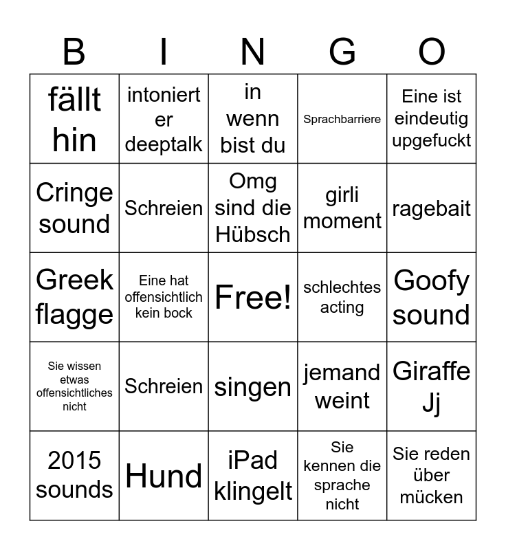 This bingo card has a free space and 24 words: Schreien, Hund, Omg sind die Hübsch, 2015 sounds, Eine ist eindeutig upgefuckt, fällt hin, Cringe sound, intoniert er deeptalk, schlechtes acting, singen, girli moment, Greek flagge, jemand weint, Giraffe Jj, Schreien, Sie kennen die sprache nicht, Goofy sound, in wenn bist du, ragebait, Eine hat offensichtlich kein bock, Sie reden über mücken, Sie wissen etwas offensichtliches nicht, Sprachbarriere and iPad klingelt.
