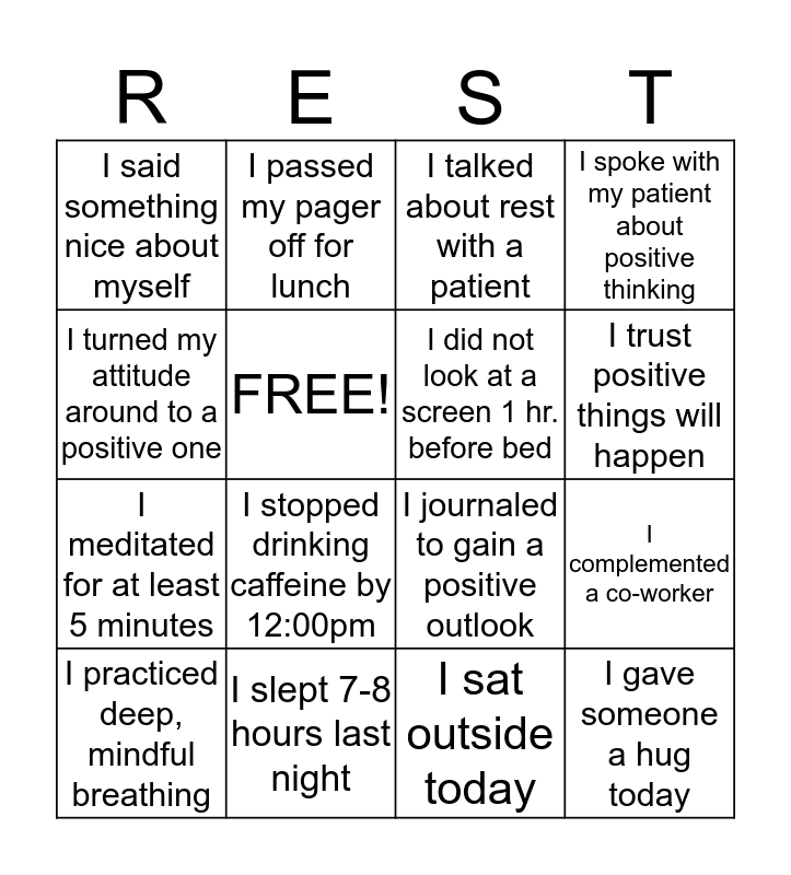 This bingo card has 16 words: I slept 7-8 hours last night, I complemented a co-worker, I talked about rest with a patient, I said something nice about myself, I meditated for at least 5 minutes, I passed my pager off for lunch, I journaled to gain a positive outlook, I sat outside today, I turned my attitude around to a positive one, FREE!, I practiced deep, mindful breathing, I spoke with my patient about positive thinking, I stopped drinking caffeine by 12:00pm, I trust positive things will happen, I did not look at a screen 1 hr. before bed and I gave someone a hug today.