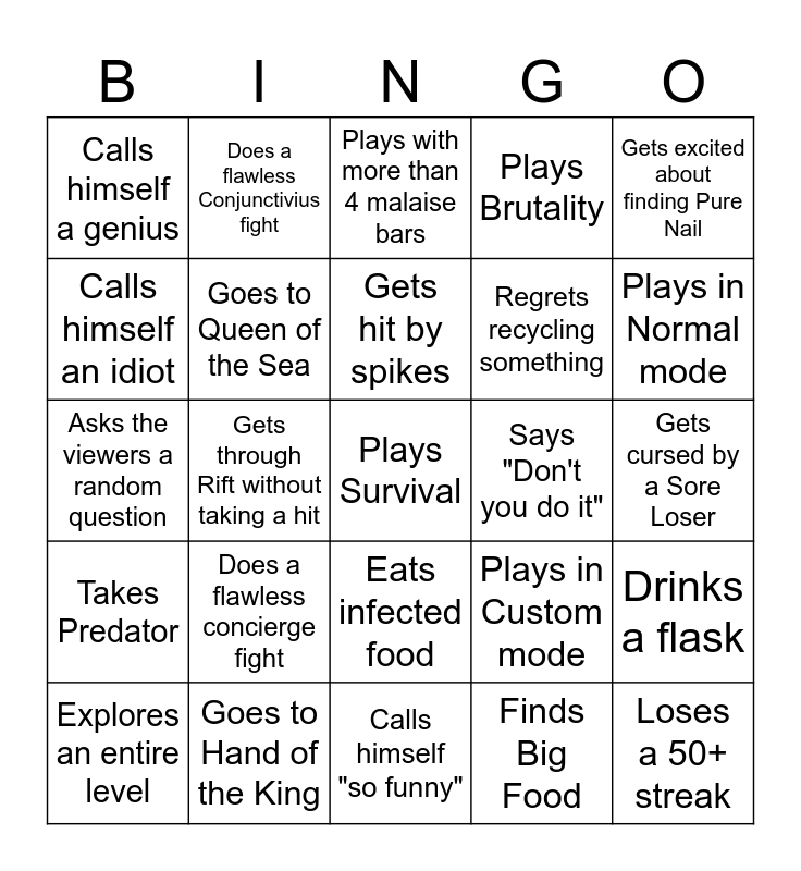 This bingo card has 35 words: Counts the highest scroll count, Says bro, Plays Tactics, Goes to Queen of the Sea, Eats infected food, Plays Brutality, Calls himself an idiot, Explains something about sports, Gets hit by spikes, Goes to Dracula, Asks the viewers a random question, Gets excited about finding Pure Nail, DanielSan does "The Arnie", Complains about a cursed biome, Calls himself a genius, Says "Don't you do it", Finds Big Food, Gets through Rift without taking a hit, Takes Predator, Plays Survival, Plays in Custom mode, Explores an entire level, Drinks a flask, Goes to Hand of the King, Plays with more than 4 malaise bars, Plays in Normal mode, Loses a 50+ streak, Calls food "protein", Regrets recycling something, Gets cursed by a Sore Loser, Slams down into spikes or poison, Calls himself "so funny", Does a flawless concierge fight, Does a flawless Conjunctivius fight and Does a flawless Scarecrow fight.