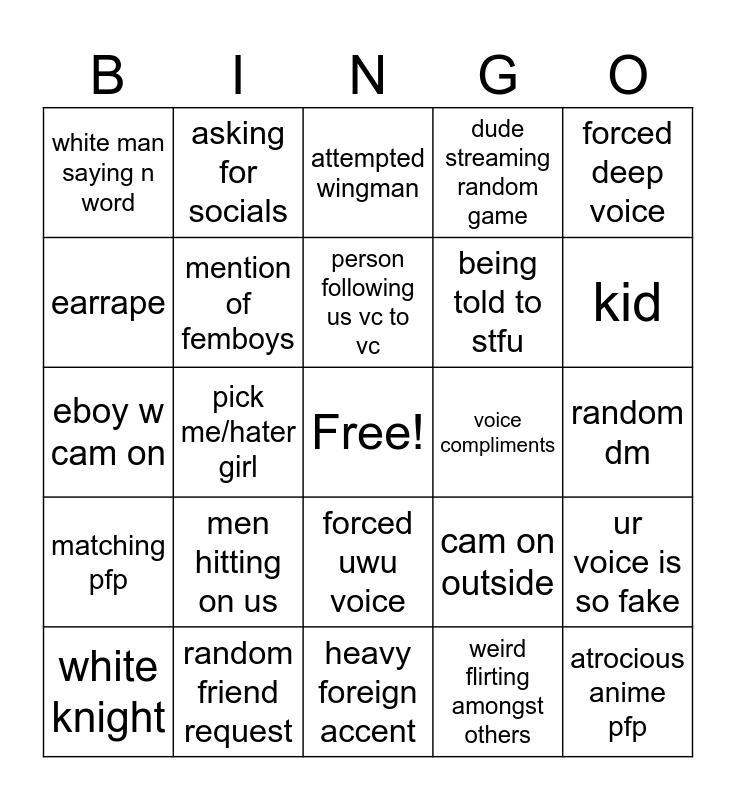 This bingo card has a free space and 24 words: men hitting on us, random friend request, person following us vc to vc, white knight, forced deep voice, white man saying n word, earrape, asking for socials, voice compliments, forced uwu voice, being told to stfu, eboy w cam on, cam on outside, ur voice is so fake, mention of femboys, weird flirting amongst others, random dm, attempted wingman, kid, pick me/hater girl, atrocious anime pfp, matching pfp, dude streaming random game and heavy foreign accent.