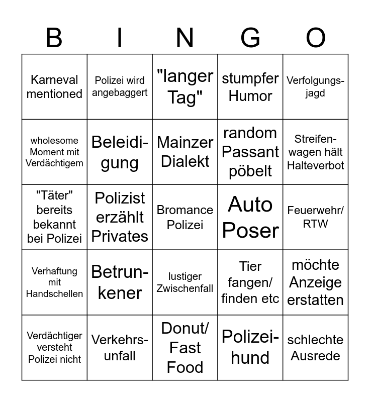 This bingo card has a free space and 24 words: Betrun-kener, Verkehrs-unfall, Mainzer Dialekt, Verdächtiger versteht Polizei nicht, Verfolgungs-jagd, Karneval mentioned, wholesome Moment mit Verdächtigem, Polizei wird angebaggert, Auto Poser, lustiger Zwischenfall, random Passant pöbelt, "Täter" bereits bekannt bei Polizei, Tier fangen/ finden etc, möchte Anzeige erstatten, Beleidi-gung, Polizei-hund, Feuerwehr/ RTW, "langer Tag", Streifen-wagen hält Halteverbot, Polizist erzählt Privates, schlechte Ausrede, Verhaftung mit Handschellen, stumpfer Humor and Donut/ Fast Food.