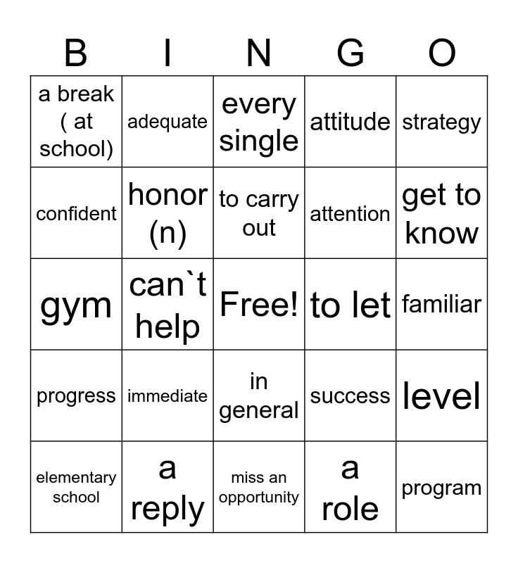 This bingo card has a free space and 29 words: elementary school, hall, can`t help, interest (n), a break ( at school), every single, honor (n), immediate, to let, a reply, familiar, program, miss an opportunity, a role, get to know, staff of a school, in general, progress, strategy, gym, success, individual, attention, confident, attitude, adequate, level, to carry out and organizer.