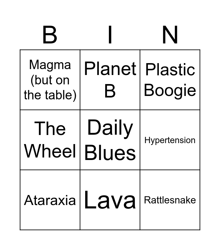 This bingo card has a free space and 8 words: Hypertension, Plastic Boogie, Planet B, Ataraxia, Magma (but on the table), Rattlesnake, The Wheel and Lava.